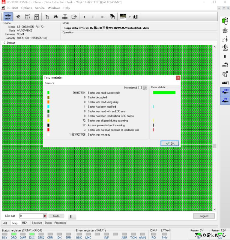 解决方案:收到硬盘后,接到数据恢复工具ACE PC3000 UDMA EXPRESS上,使用希捷F3热交换处理技术,检测发现有个磁头损坏,在无尘环境打开盘体,更换兼容的磁头,再热交换处理好固件问题后,硬盘正常认盘,分头镜像,成功恢复客户硬盘内几乎全部数据!