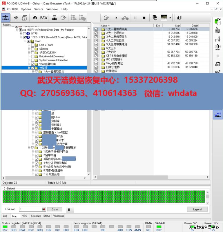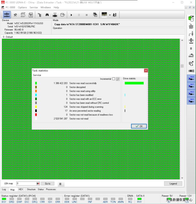 解决方案:收到硬盘后,我们在无尘环境更换兼容的磁头,再更换兼容的SATA解锁电路板,接到专业数据恢复工具PC3000 UDMA EXPRESS上,通电硬盘正常认盘,备份关键固件后,DE分头,再原usb板改SATA,通电镜像,最后客户硬盘内的重要数据基本完美恢复!