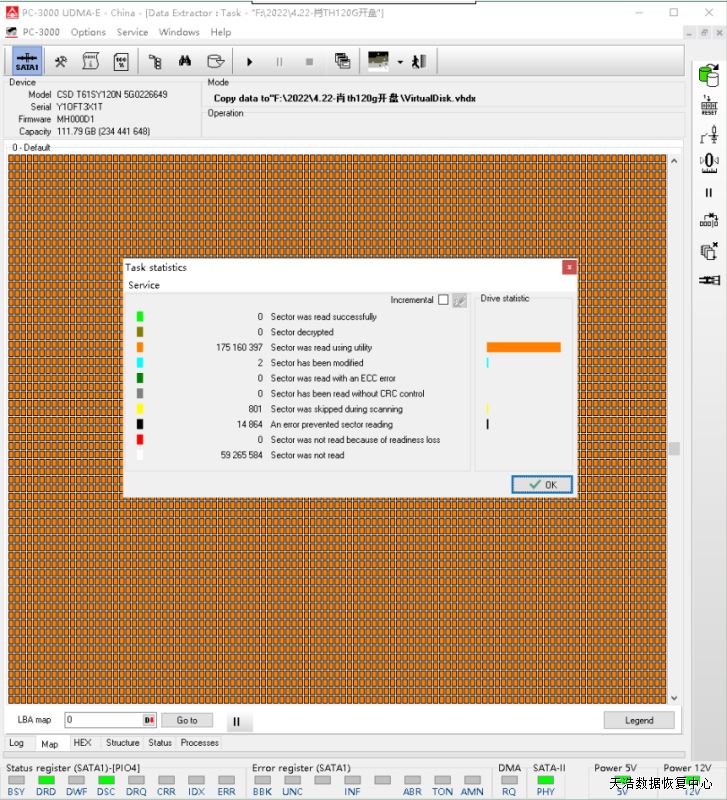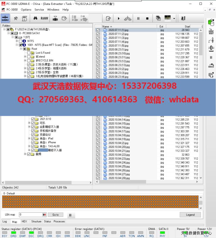解决方案:收到硬盘后,我们拆开盒子,发现里面是一个返修过的东芝120G硬盘,标上没有型号,根据外观和电路板号,找了一个兼容的配件,在无尘环境更换兼容的磁头,再接到数据恢复工具PC3000 UDMA EXPRESS上,通电正常认盘,DE镜像,成功恢复客户硬盘里面的绝大部分数据。