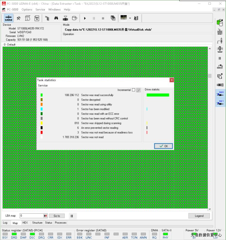 解决方案:收到硬盘后,在无尘环境打开盘体,更换兼容的磁头,接到数据恢复工具ACE PC3000 UDMA EXPRESS上,通电硬盘正常认盘,分头镜像,成功恢复客户硬盘内几乎全部数据!