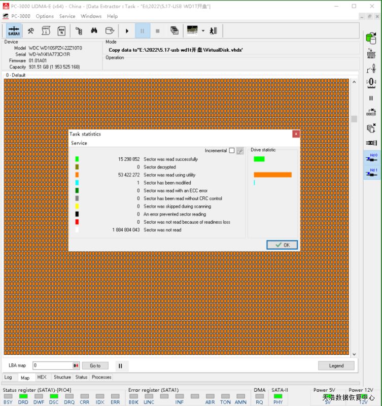 解决方案:收到硬盘后,我们在无尘环境拆开,检测发现盘片没划伤,更换兼容的磁头,原SATA电路板解锁,接到专业数据恢复工具PC3000 UDMA EXPRESS上,通电硬盘正常认盘,DE分头测试,2个头镜像都正常,最后客户硬盘内重要数据均完美恢复!