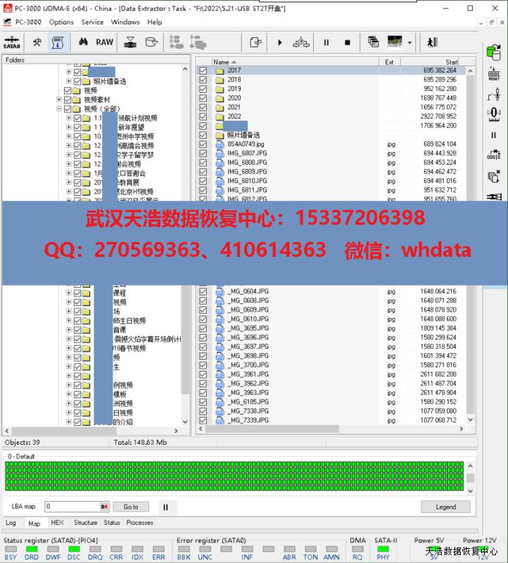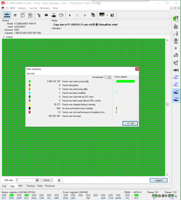 解决方案:收到硬盘后,我们在无尘环境打开盘体,更换兼容的磁头,再接到数据恢复工具PC-3000 UDMA Express上,通电,硬盘正常认盘,镜像,成功恢复客户硬盘内绝大部分数据!