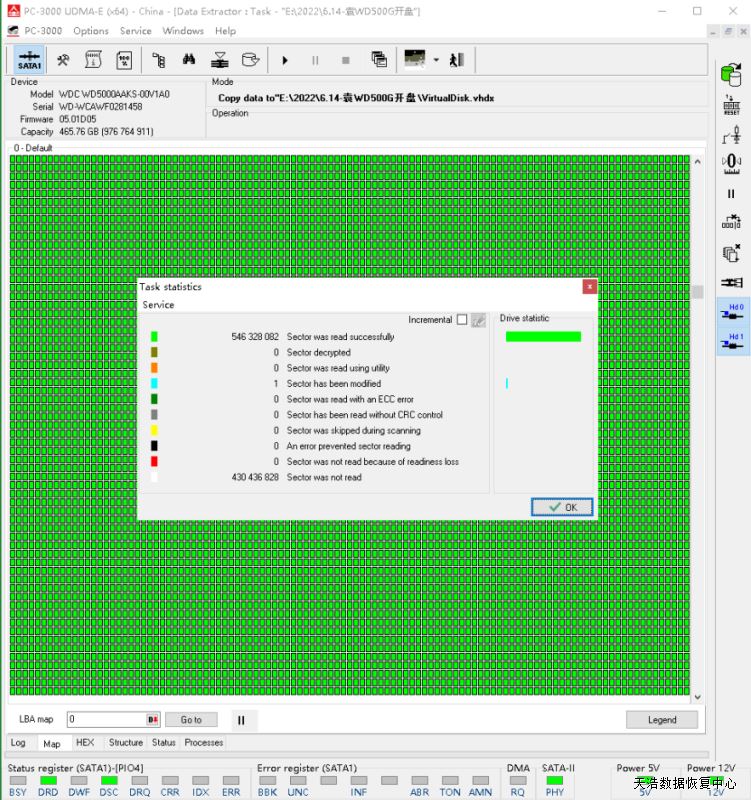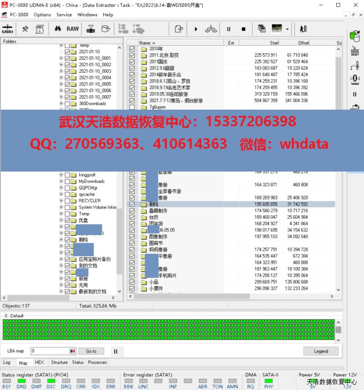解决方案:收到硬盘后,我们在无尘环境更换匹配的磁头,再接到数据恢复工具PC-3000 UDMA Express上,通电正常认盘,DE镜像,成功恢复硬盘里面几乎全部资料。