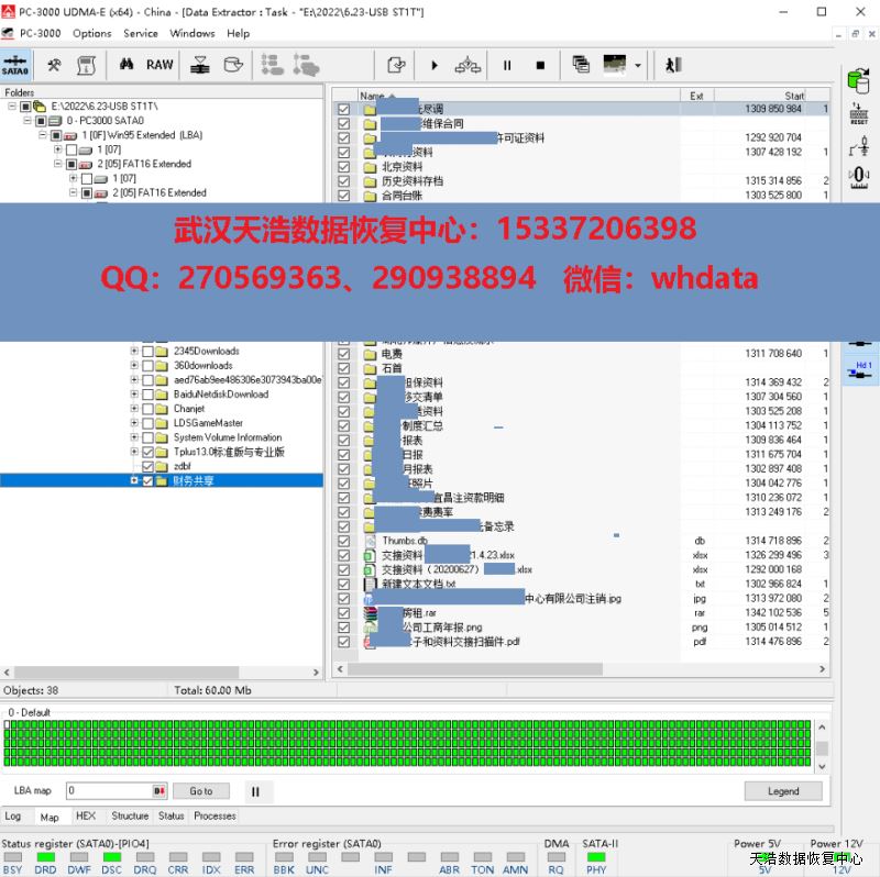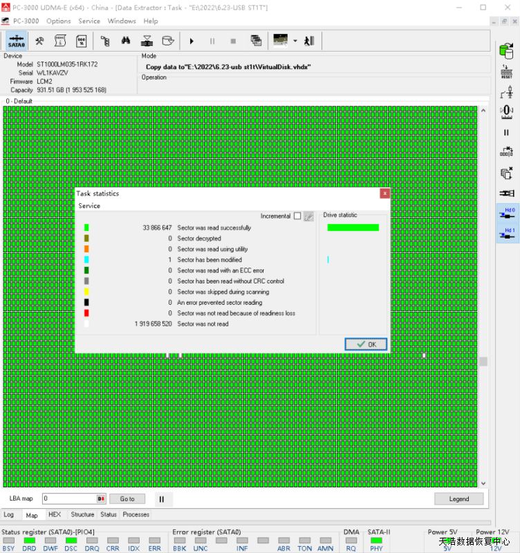 解决方案:收到硬盘后,在无尘环境打开盘体,更换兼容的磁头,接到数据恢复工具ACE PC3000 UDMA EXPRESS上,通电硬盘正常认盘,分头镜像,成功恢复客户硬盘内大部分数据!
