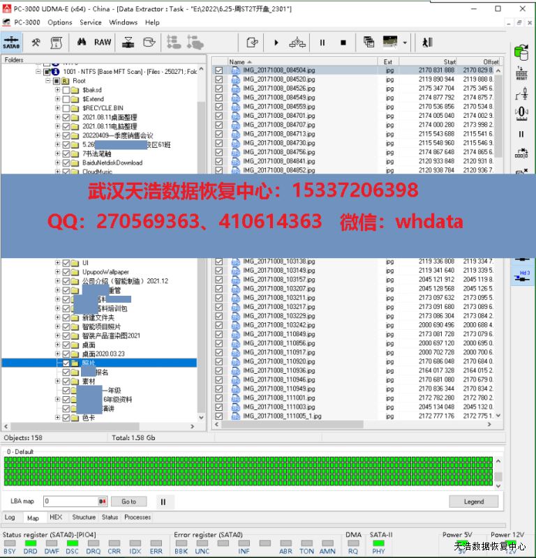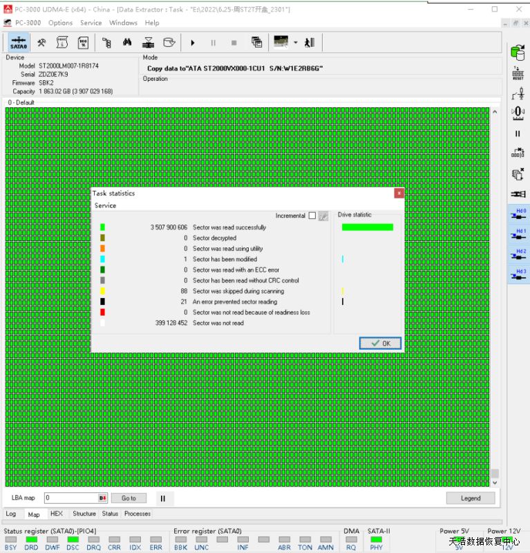 解决方案:收到硬盘后,我们在无尘环境打开盘体,更换兼容的磁头,再接到数据恢复工具PC-3000 UDMA Express上,通电,硬盘正常认盘,做好镜像前的固件处理工作后,DE分头镜像,最后客户硬盘内的数据基本完美恢复!