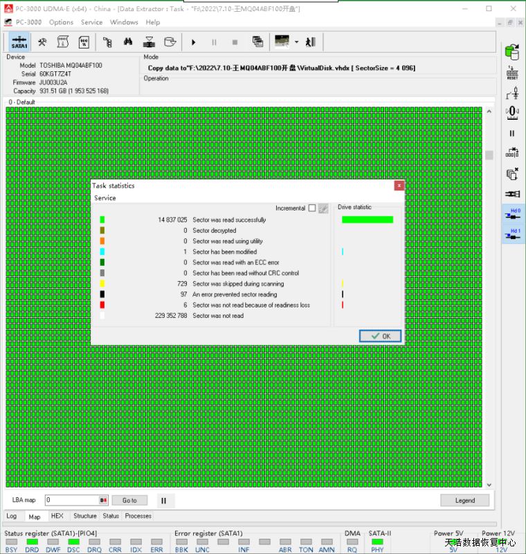 解决方案:收到硬盘后,我们在无尘环境更换兼容的磁头,接到数据恢复工具PC3000 UDMA EXPRESS上,通电认盘,DE镜像,成功恢复客户硬盘内几乎全部数据。