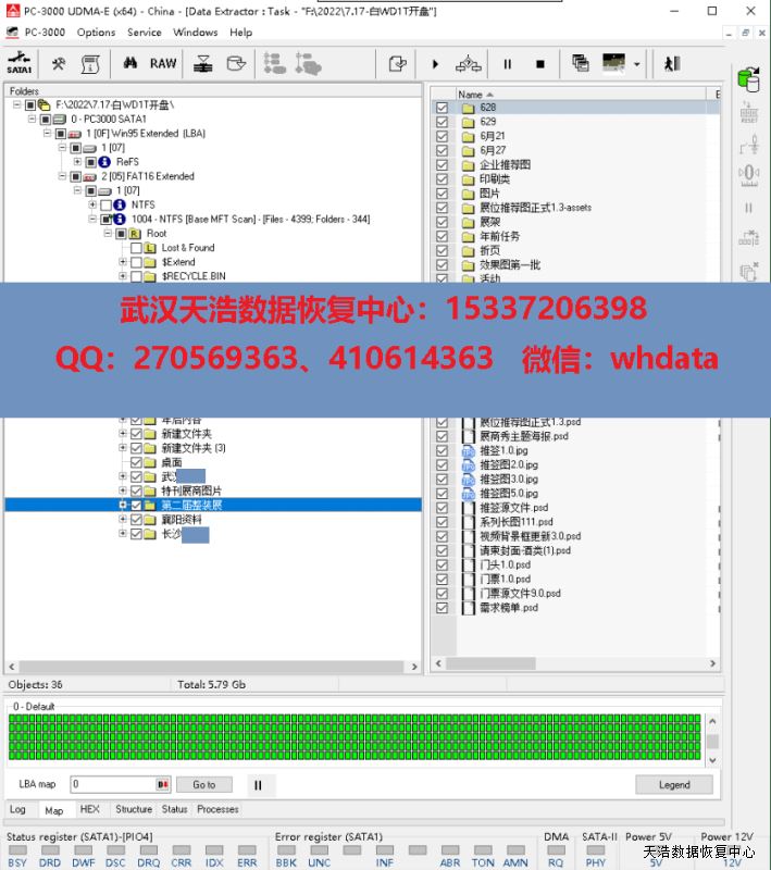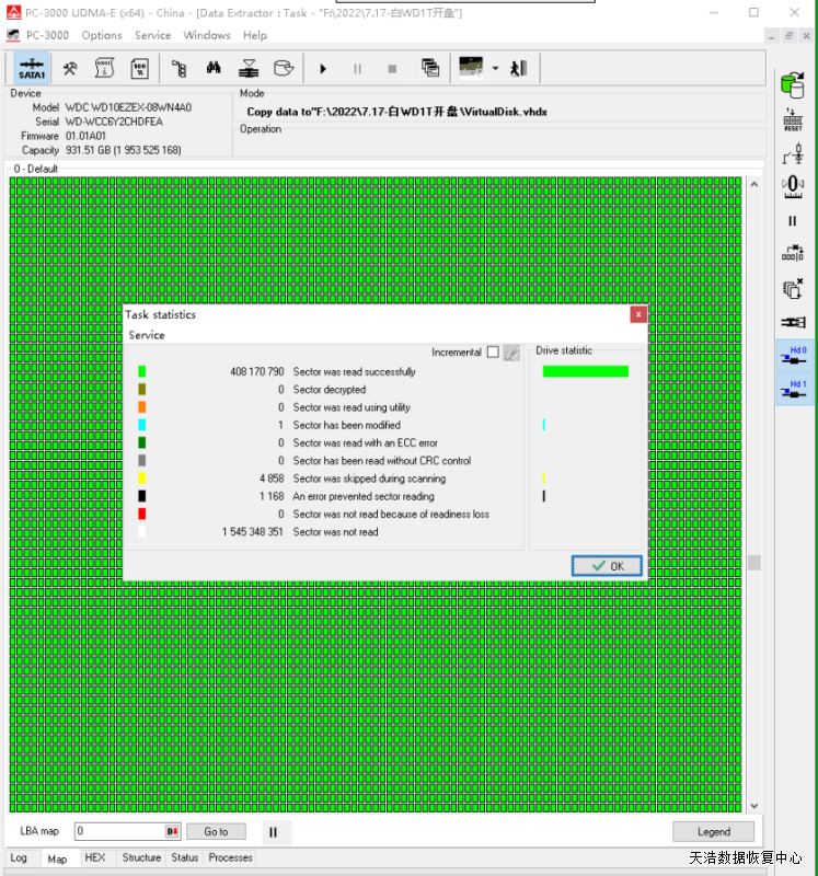 解决方案:收到硬盘后,我们在无尘环境更换匹配的磁头,再接到数据恢复工具 PC-3000 UDMA Express上,通电正常认盘,DE镜像,成功恢复硬盘内绝大部分数据。
