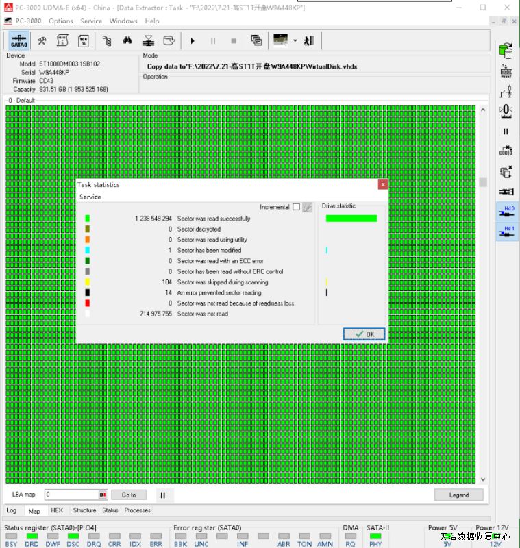 解决方案:收到硬盘后,接到数据恢复工具ACE PC3000 UDMA EXPRESS上,修复固件问题后,通电硬盘正常认盘,DE分头镜像,发现0头不良,在无尘环境更换兼容的磁头,通电硬盘认盘,再镜像,成功恢复客户硬盘内几乎全部数据!