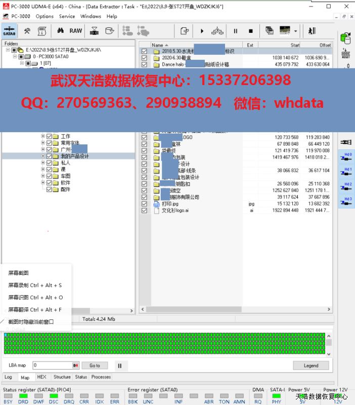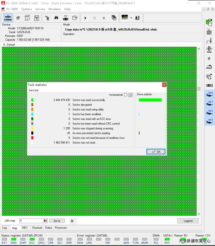 解决方案:收到硬盘后,我们在无尘环境打开盘体,更换兼容的磁头,再接到数据恢复工具PC-3000 UDMA Express上,通电,硬盘正常认盘,做好镜像前的固件处理工作后,DE分头镜像,最后客户硬盘内的数据基本完美恢复!
