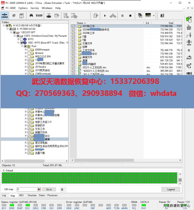 解决方案:收到硬盘后,我们在无尘环境更换兼容的磁头,再更换兼容的SATA解锁电路板,接到专业数据恢复工具PC3000 UDMA EXPRESS上,通电硬盘认盘,备份固件后,DE建镜像任务,分头,镜像,最后客户硬盘内重要数据完美恢复!