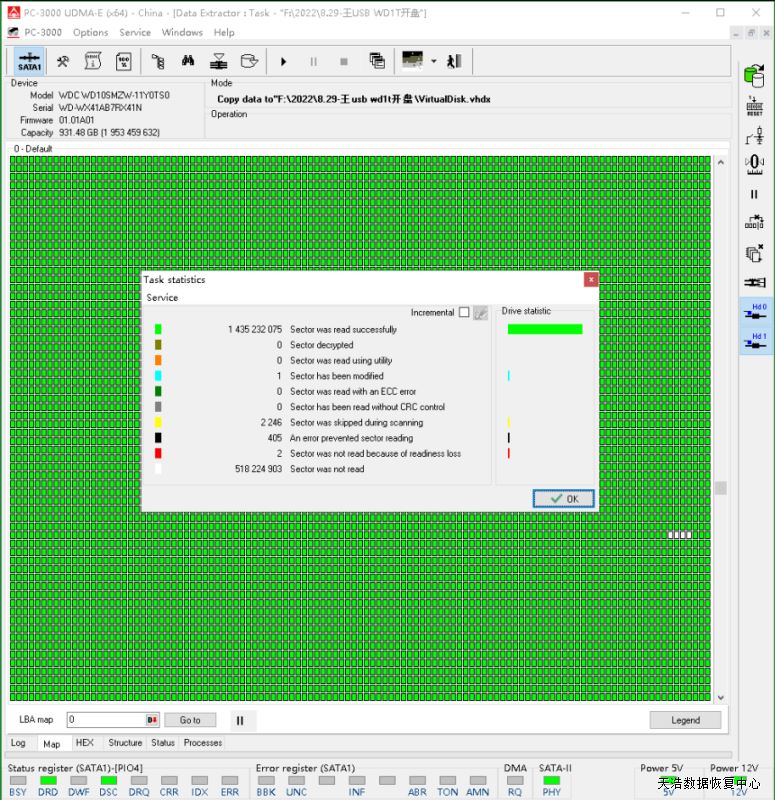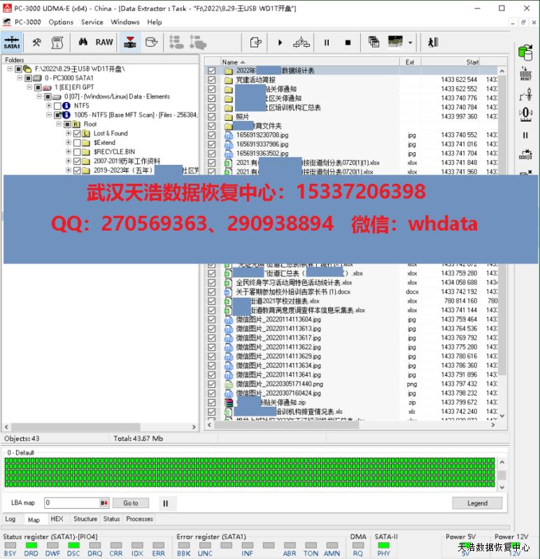 解决方案:收到硬盘后,在无尘环境更换兼容的磁头,再更换兼容的SATA解锁电路板,接到专业数据恢复工具PC3000 UDMA EXPRESS上,通电硬盘认盘,备份好关键固件,DE分头镜像,最后客户硬盘内重要数据大部分都成功恢复!