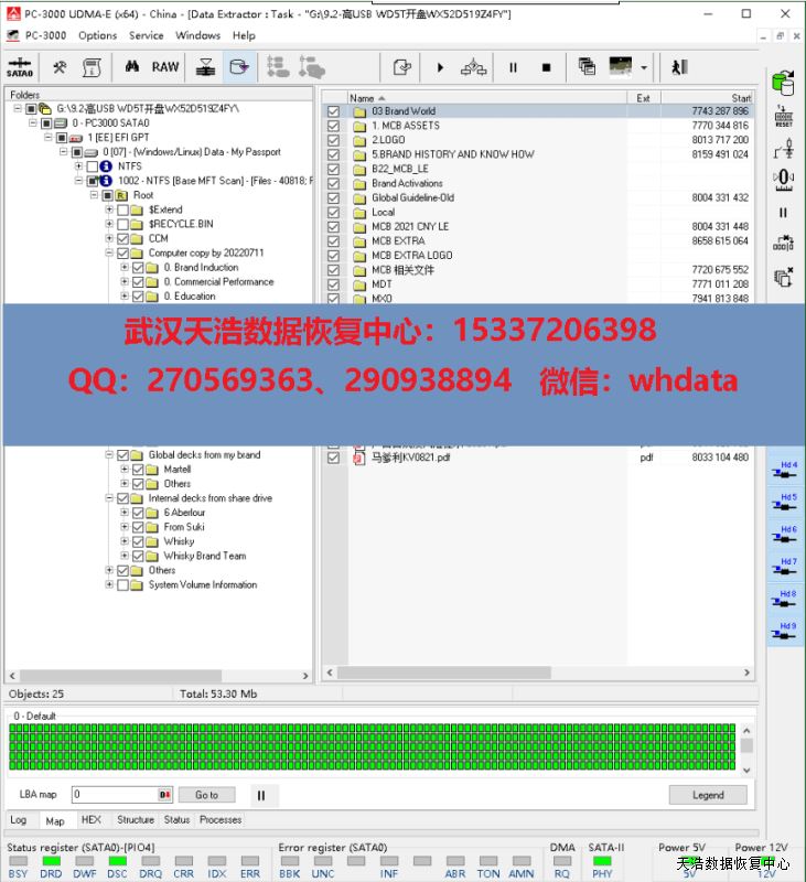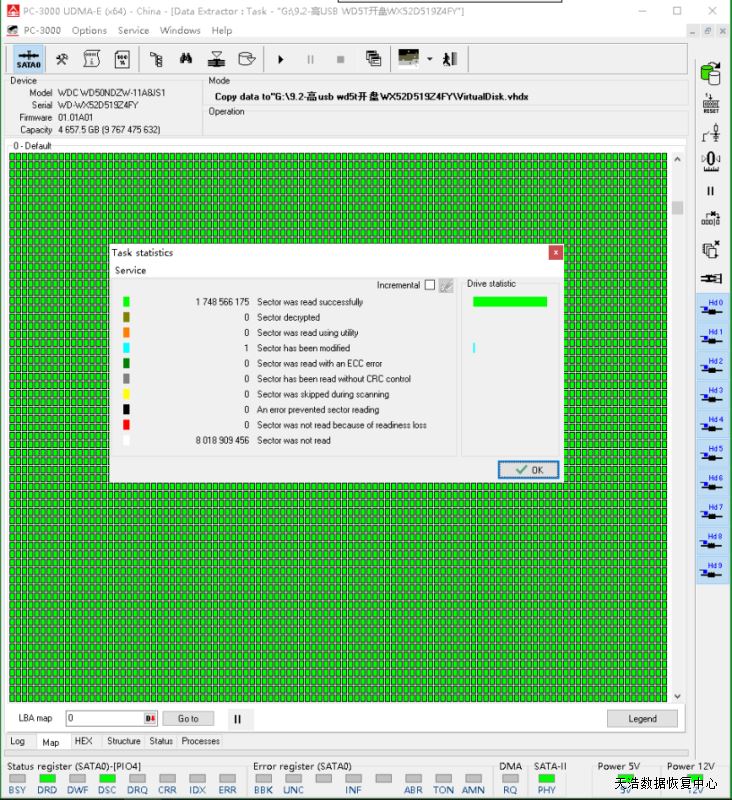 解决方案:收到硬盘后,我们在无尘环境更换兼容的全好磁头,使用专业数据恢复工具ACE PC-3000 UDMA Express进行原始usb板解锁,再手工改sata,通电硬盘正常认盘,固件问题常规处理,DE分头,再镜像,最后成功恢复客户硬盘内几乎全部重要数据!