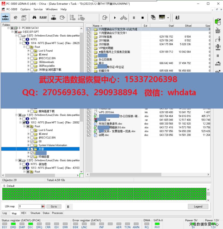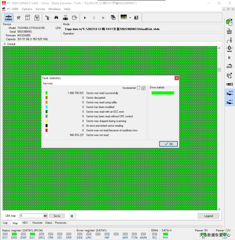 解决方案:收到硬盘后,我们在无尘环境更换兼容的磁头,接到专业数据恢复工具PC-3000 UDMA Express上,通电硬盘正常认盘,DE镜像,成功恢复客户硬盘内全部数据。