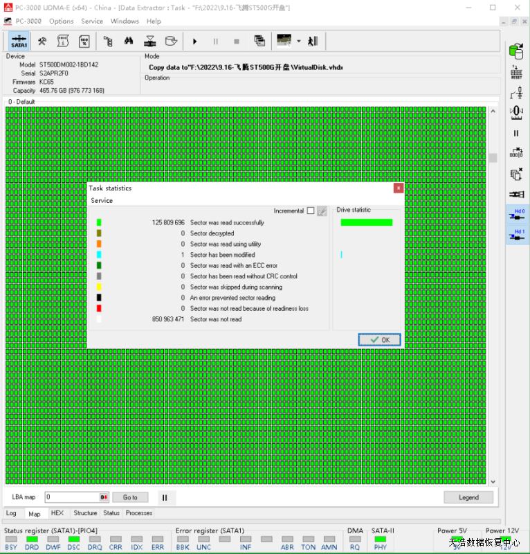 解决方案:收到硬盘后,在无尘环境拆开盘体,更换兼容的磁头,再接到专业的数据恢复工具PC3000 UDMA EXPRESS上,通电硬盘正常认盘,DE镜像,成功恢复硬盘内几乎全部数据!