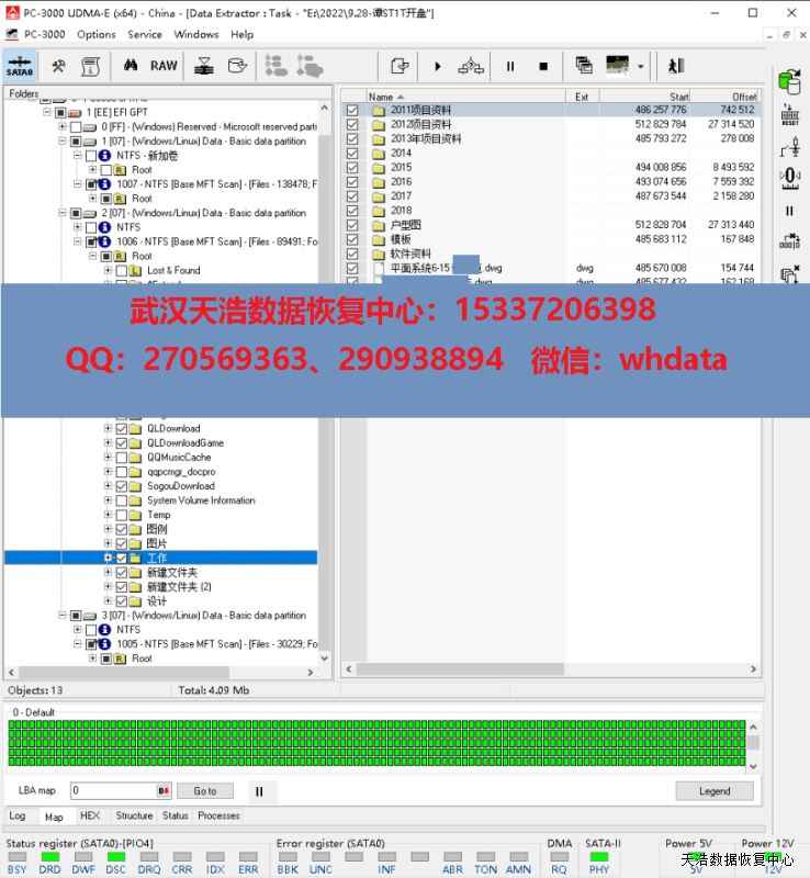 解决方案:收到硬盘后,我们在无尘环境打开盘体,更换兼容的磁头,再接到数据恢复工具PC-3000 UDMA Express上,通电,硬盘正常认盘,做好镜像前的固件处理工作后,DE分头镜像,最后客户硬盘内的数据基本完美恢复!
