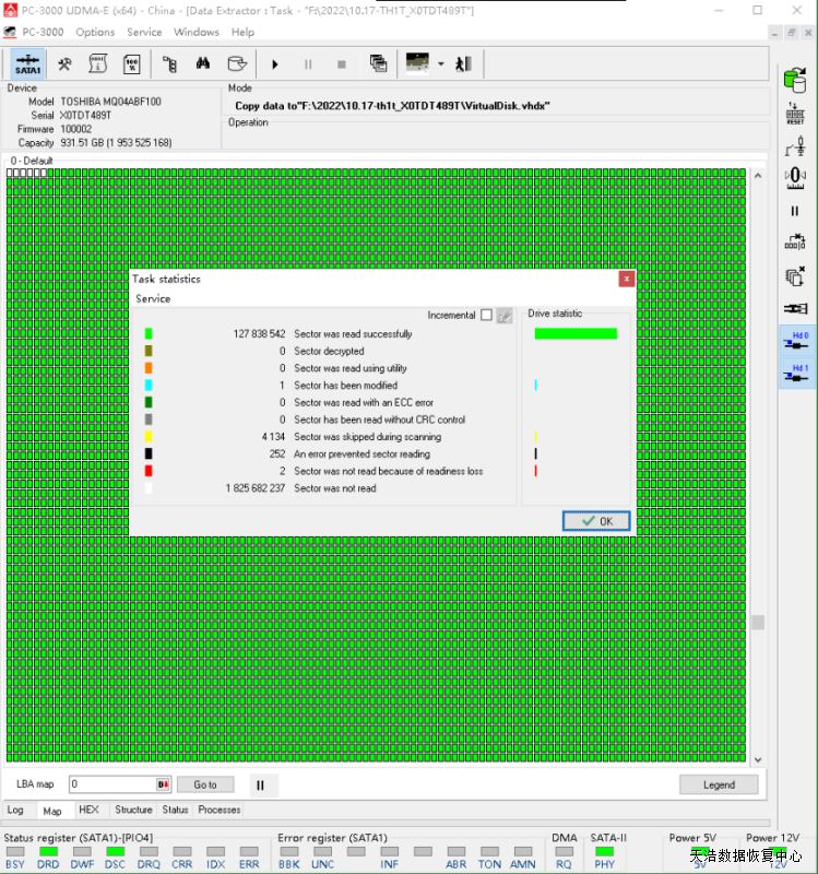 解决方案:收到硬盘后,我们在无尘环境更换兼容的磁头,接到数据恢复工具PC3000 UDMA EXPRESS上,通电认盘,DE镜像,成功恢复客户硬盘内几乎全部数据。