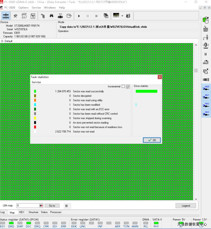 解决方案:收到硬盘后,在无尘环境打开盘体,更换兼容的磁头,然后接到数据恢复工具PC-3000 UDMA Express上,通电,硬盘正常认盘,备份好固件,再DE分头镜像,最后客户硬盘内的数据基本完美恢复!