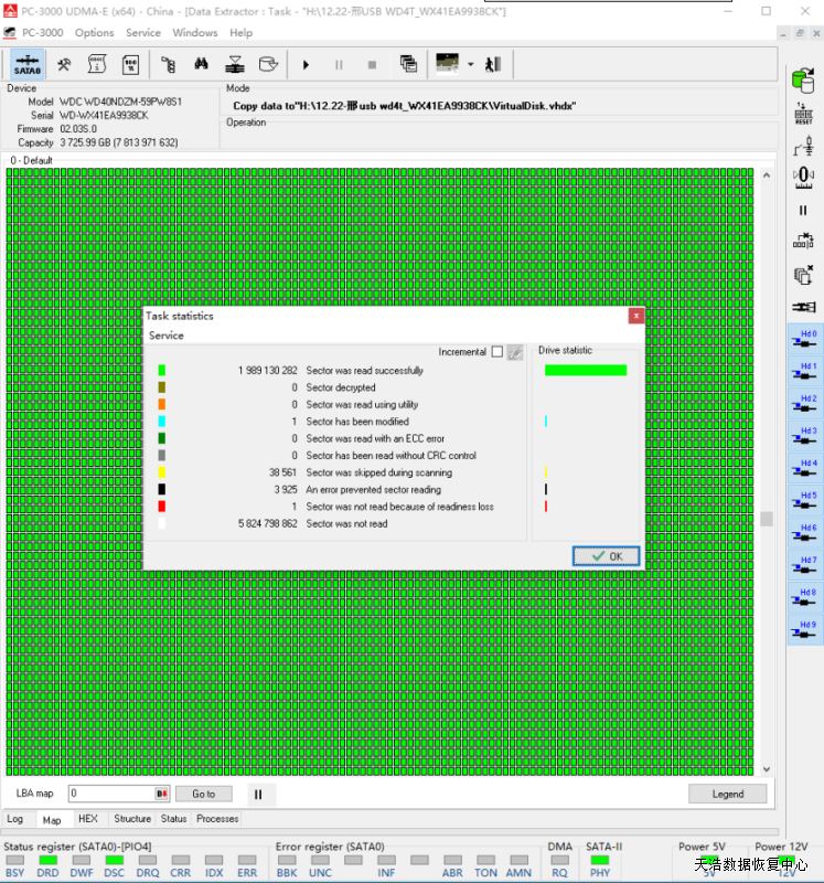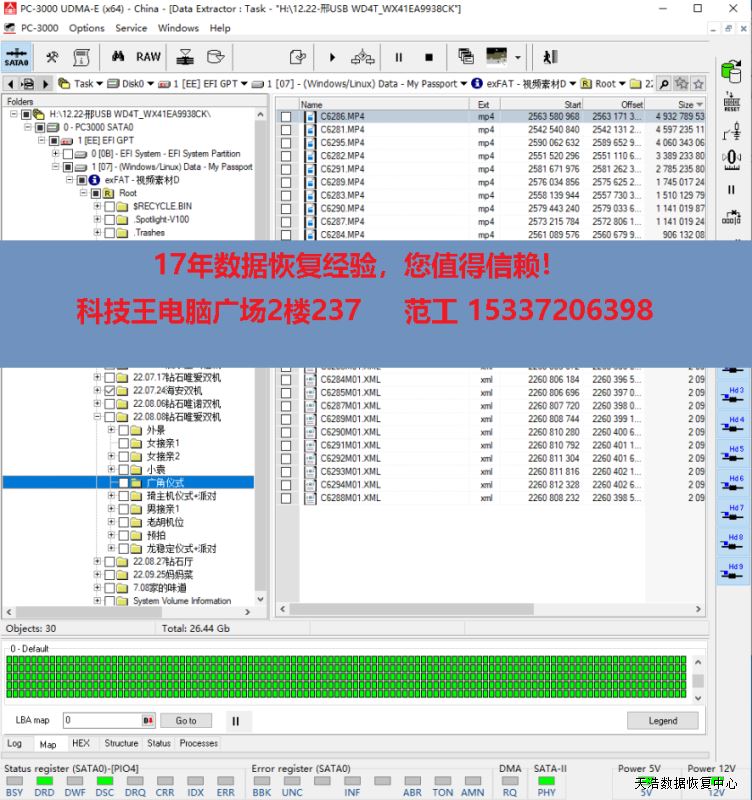解决方案:收到硬盘后,我们接到专业数据恢复工具ACE PC3000 UDMA EXPRESS上,通过热交换技术处理后,数据区正常访问,DE分头镜像后,硬盘影楼客户的大部分视频数据成功恢复!