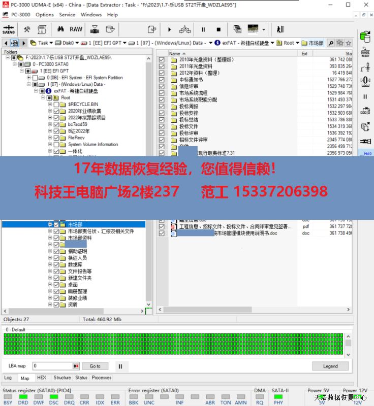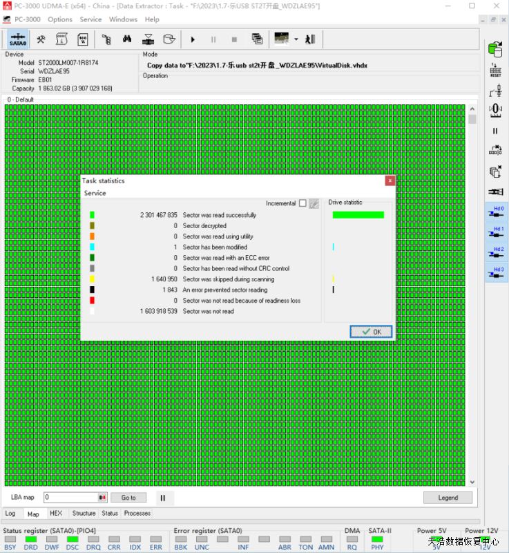 解决方案:收到硬盘后,接到数据恢复工具PC-3000 UDMA Express上,通电硬盘不认盘,检测修复固件后,再断电通电,硬盘正常认盘,再DE分头镜像,最后客户硬盘内的数据基本完美恢复!