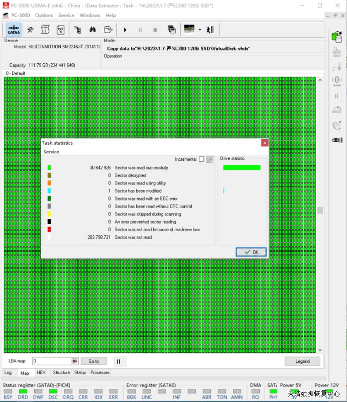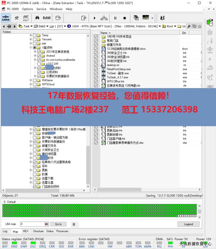 解决方案:收到硬盘后,我们使用专业的SSD恢复工具ACE PC3000 SSD,短接通电就绪后,虚拟重建编译器,再用PC3000 DE虚拟镜像,成功恢复客户硬盘内几乎全部数据。