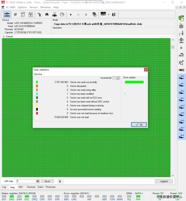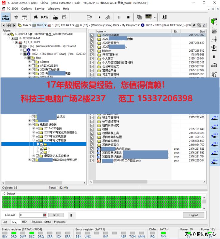 解决方案:收到硬盘后,我们在无尘环境更换兼容的磁头,再原ROM解锁,原始usb板改SATA,接到专业数据恢复工具ACE PC3000 UDMA EXPRESS上,通电硬盘声音正常认盘,备份好固件,DE分头镜像,最后成功恢复出客户硬盘内的几乎全部重要数据!