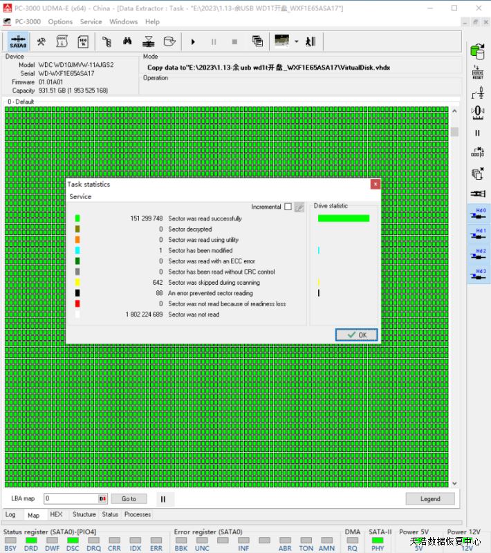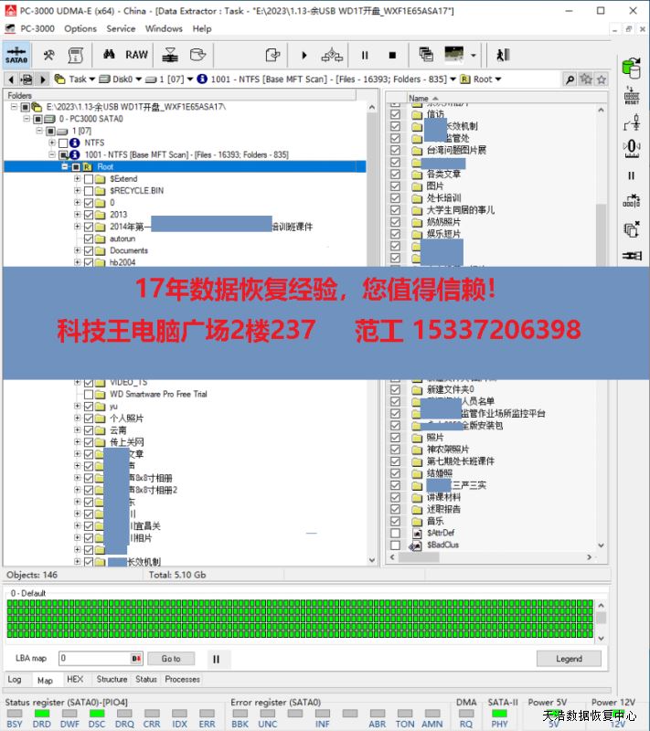 解决方案:收到硬盘后,在无尘环境更换兼容的磁头,再更换兼容的SATA电路板,接到专业数据恢复工具PC3000 UDMA EXPRESS上,通电硬盘认盘,备份好关键固件,DE分头镜像,最后客户硬盘内的数据基本完美恢复!