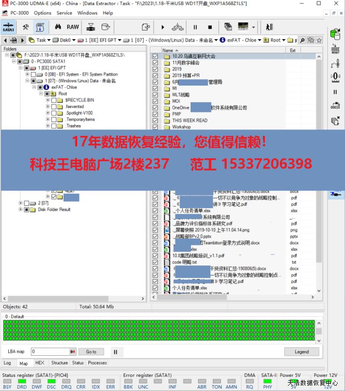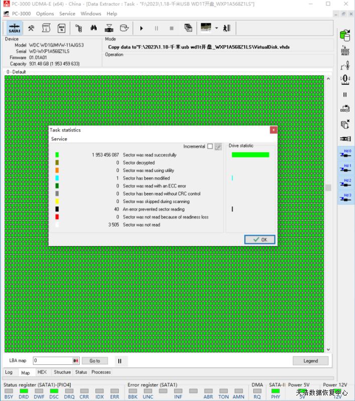 解决方案:收到硬盘后,我们在无尘环境更换兼容的磁头,再更换兼容的SATA电路板,接到专业数据恢复工具PC3000 UDMA EXPRESS上,通电硬盘不认盘,处理固件后,断电通电硬盘正常认盘,DE分头镜像,最后客户硬盘内重要数据基本完美恢复!