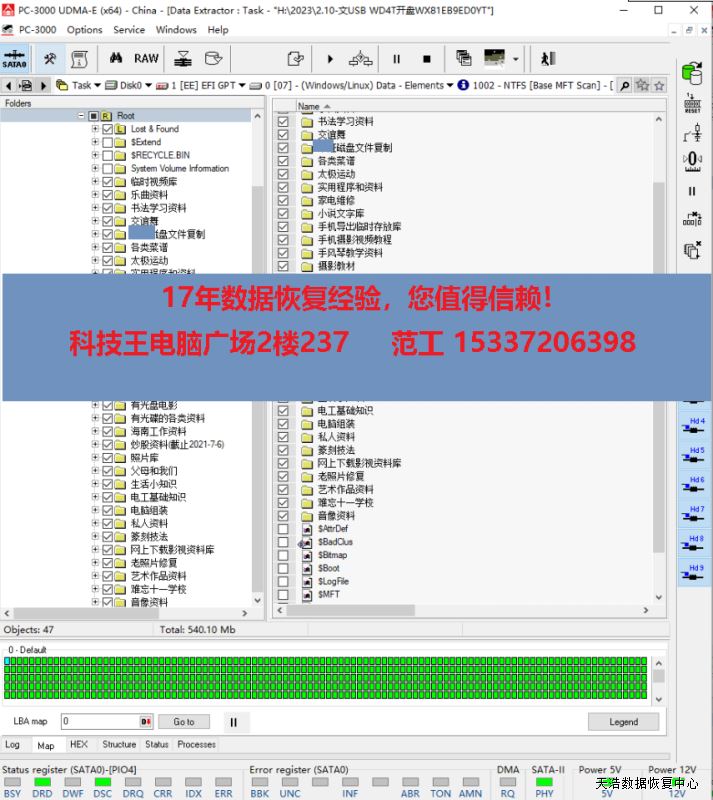 解决方案:收到硬盘后,我们原ROM解锁,原始usb板改SATA,接到专业数据恢复工具ACE PC3000 UDMA EXPRESS上,通电硬盘声音正常认盘后忙,备份检测修复固件,再断电通电,硬盘认盘正常,DE分头,发现有磁头损坏,在无尘环境更换兼容的磁头,再通电硬盘认盘,镜像,最后成功恢复出客户硬盘内的几乎全部重要数据!