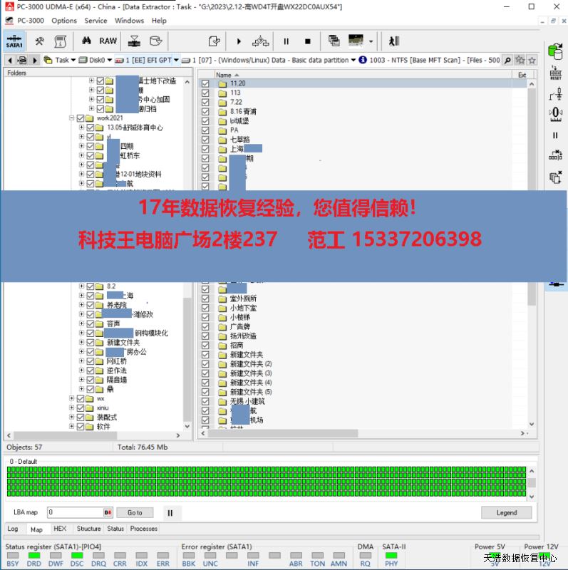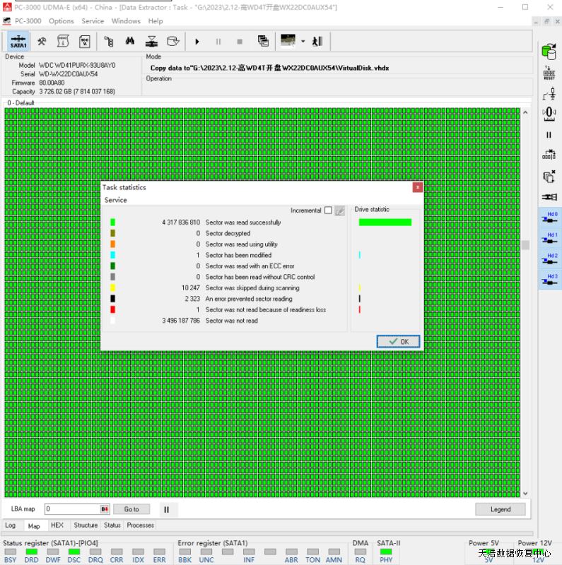 解决方案:收到硬盘后,通过数据恢复工具ACE PC3000 UDMA EXPRESS原板解锁后,检测发现是磁头损坏,在无尘环境开盘更换兼容的磁头,再接到ACE PC3000 UDMA EXPRESS上,通电检测备份修复固件后,再断电通电,硬盘正常认盘,DE分头镜像,成功恢复客户硬盘内几乎全部重要数据。