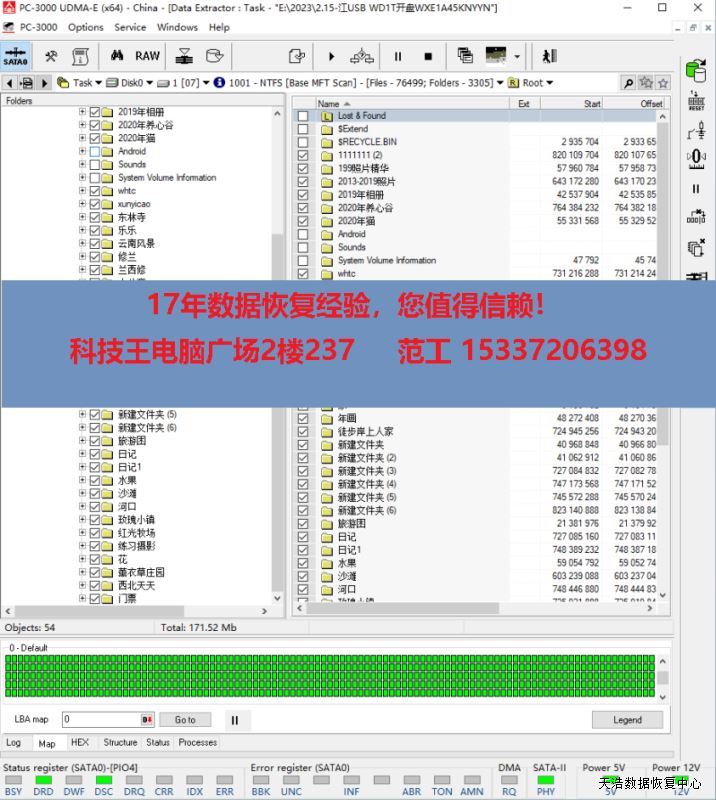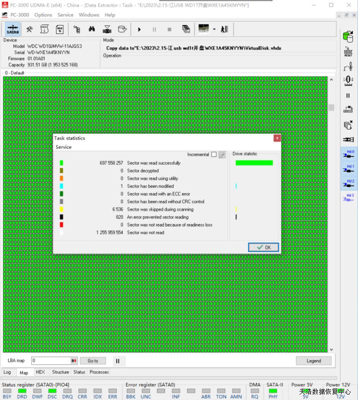 解决方案:收到硬盘后,在无尘环境更换兼容的磁头,再更换兼容的SATA电路板,接到专业数据恢复工具PC3000 UDMA EXPRESS上,通电硬盘认盘,备份好关键固件,DE分头镜像,最后客户硬盘内的数据大部分成功恢复!
