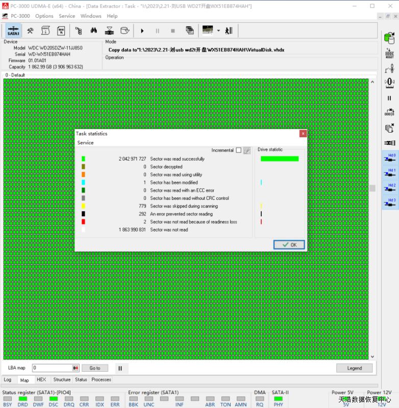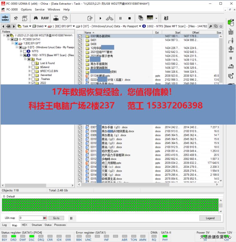 解决方案:收到硬盘后,我们在无尘环境更换兼容的磁头,再原usb板原板解锁,改SATA,接到专业数据恢复工具PC3000 UDMA EXPRESS上,通电硬盘正常认盘,备份好关键固件后,DE分头镜像,最后客户硬盘内数据基本完美恢复!