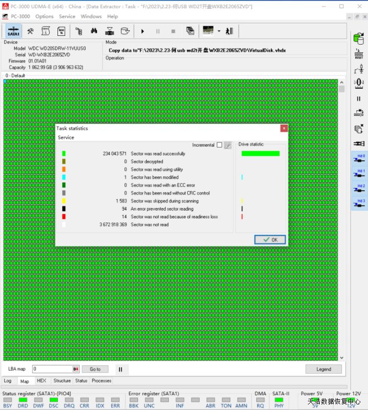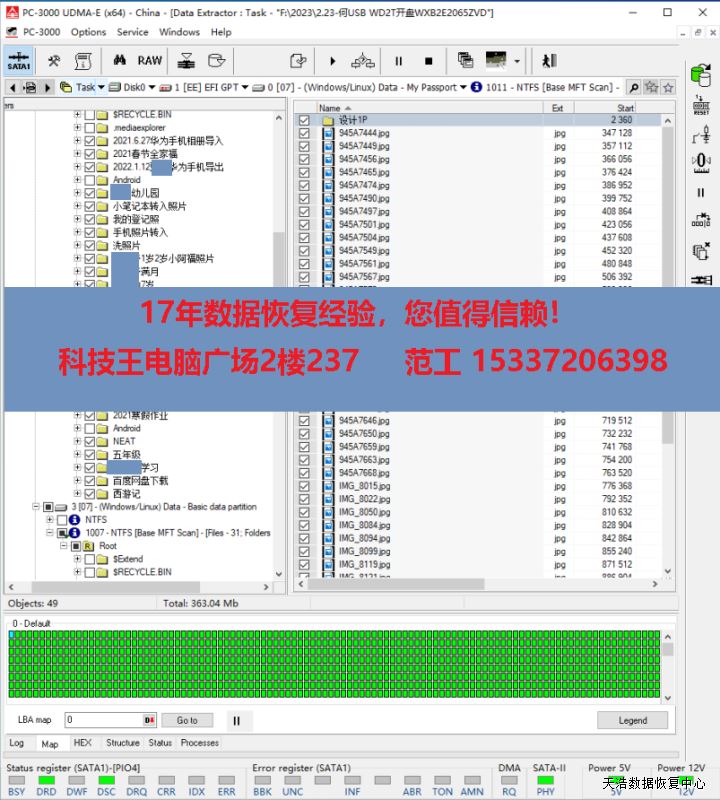 解决方案:收到硬盘后,我们在无尘环境更换兼容的磁头,再原usb板原板解锁,改SATA,接到专业数据恢复工具PC3000 UDMA EXPRESS上,通电硬盘正常认盘,备份好关键固件后,DE分头镜像,最后客户硬盘内数据基本完美恢复!