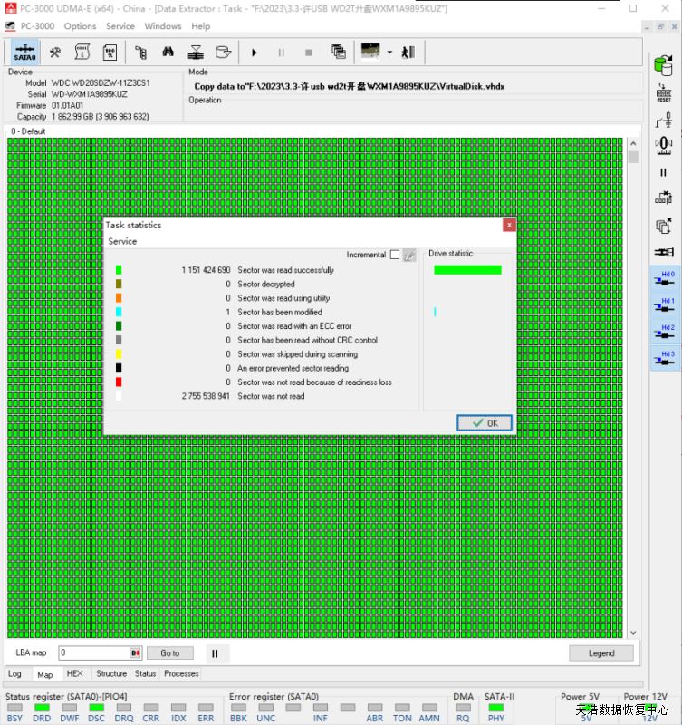 解决方案:收到硬盘后,我们在无尘环境更换兼容的磁头,更换兼容的SATA解锁板,接到专业数据恢复工具PC3000 UDMA EXPRESS上,通电硬盘正常认盘,备份好关键固件后,DE分头镜像,最后客户硬盘内500多g的数据均完美恢复!