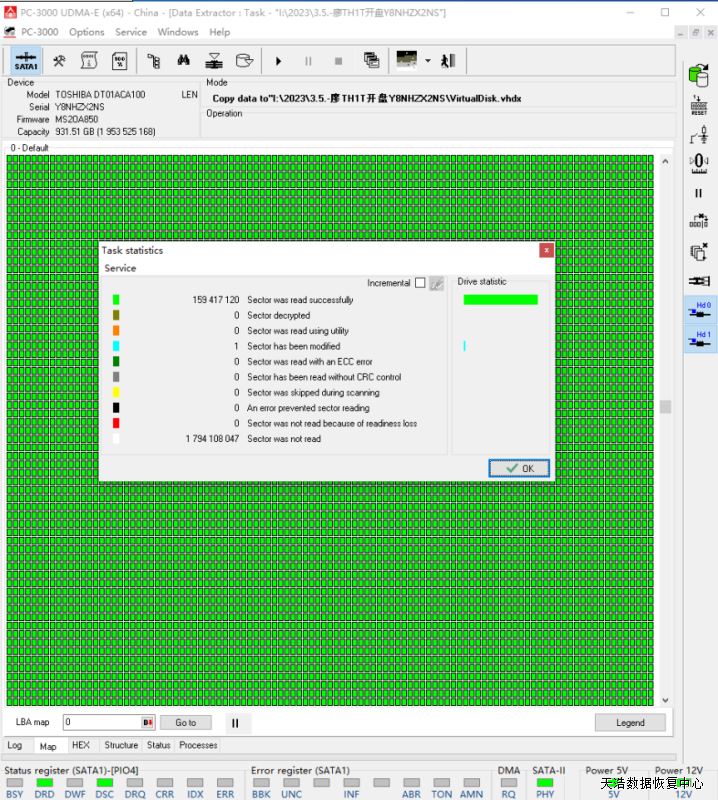解决方案:收到硬盘后,我们在无尘环境更换兼容的磁头,接到专业数据恢复工具PC-3000 UDMA Express上,通电硬盘正常认盘,DE镜像,成功恢复客户硬盘内全部重要数据!