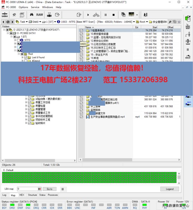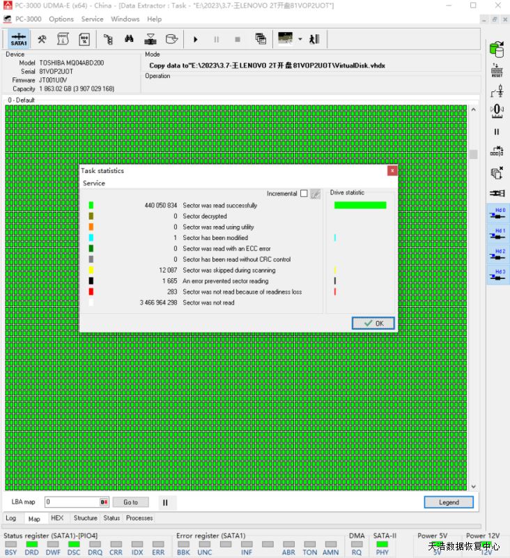 解决方案:收到硬盘后,我们在无尘环境更换兼容的磁头,接到数据恢复工具PC3000 UDMA EXPRESS上,通电认盘,DE镜像,成功恢复客户硬盘里面的几乎全部数据。