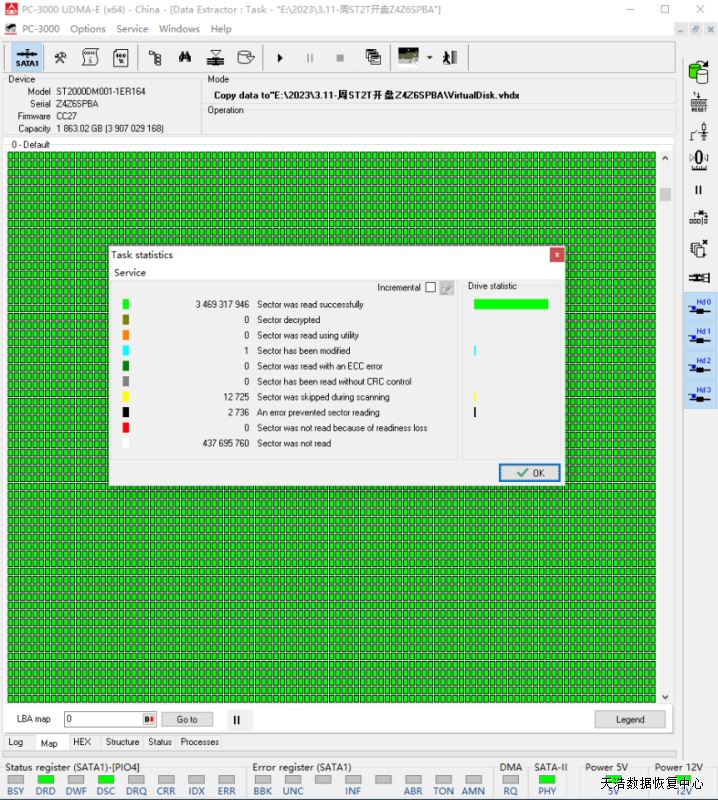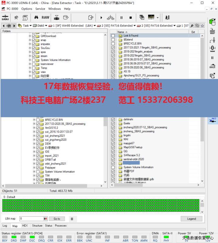 解决方案:收到硬盘后,接到专业的数据恢复工具PC3000 UDMA EXPRESS上,通电备份好固件,做固件常规处理后,DE建任务分头镜像,发现一个磁头不良,在无尘环境内更换兼容的磁头,再镜像,最后成功恢复硬盘内大部分数据!