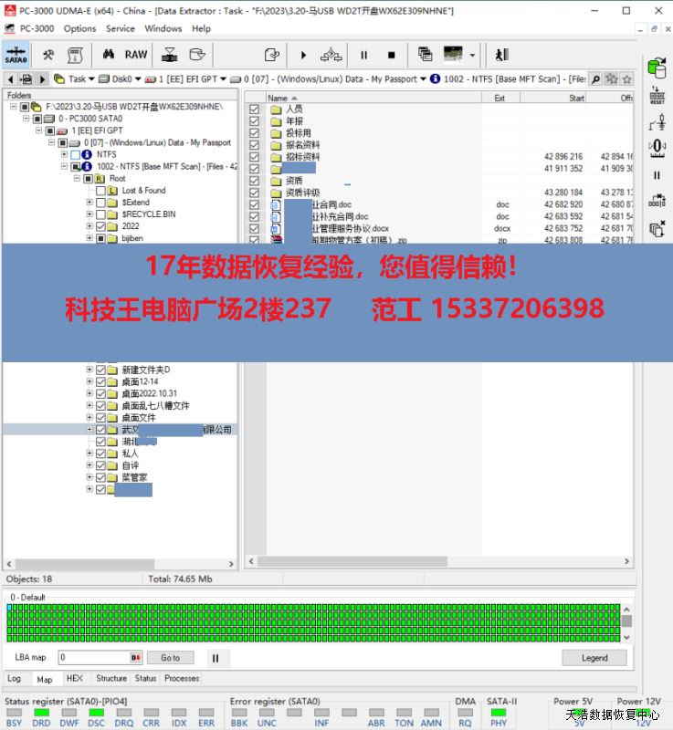 解决方案:收到硬盘后,我们在无尘环境更换兼容的磁头,再原usb板解锁改SATA,接到专业数据恢复工具PC3000 UDMA EXPRESS上,通电硬盘正常认盘,备份好关键固件后,DE分头镜像,最后客户硬盘内数据基本完整恢复!