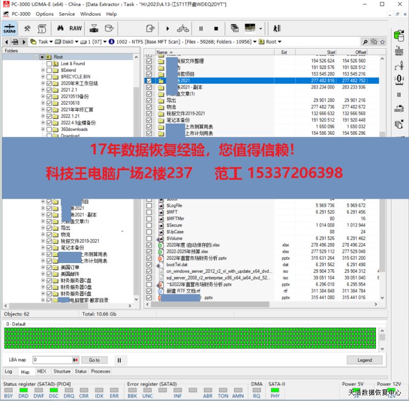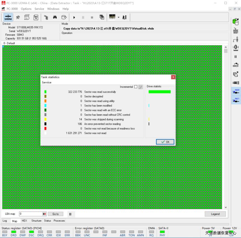 解决方案:收到硬盘后,我们在无尘环境打开盘体,更换兼容的磁头,再接到数据恢复工具PC-3000 UDMA Express上,通电,硬盘不认盘,备份处理固件后,断电通电硬盘正常认盘,DE分头镜像,最后客户硬盘内重要数据基本完美恢复!