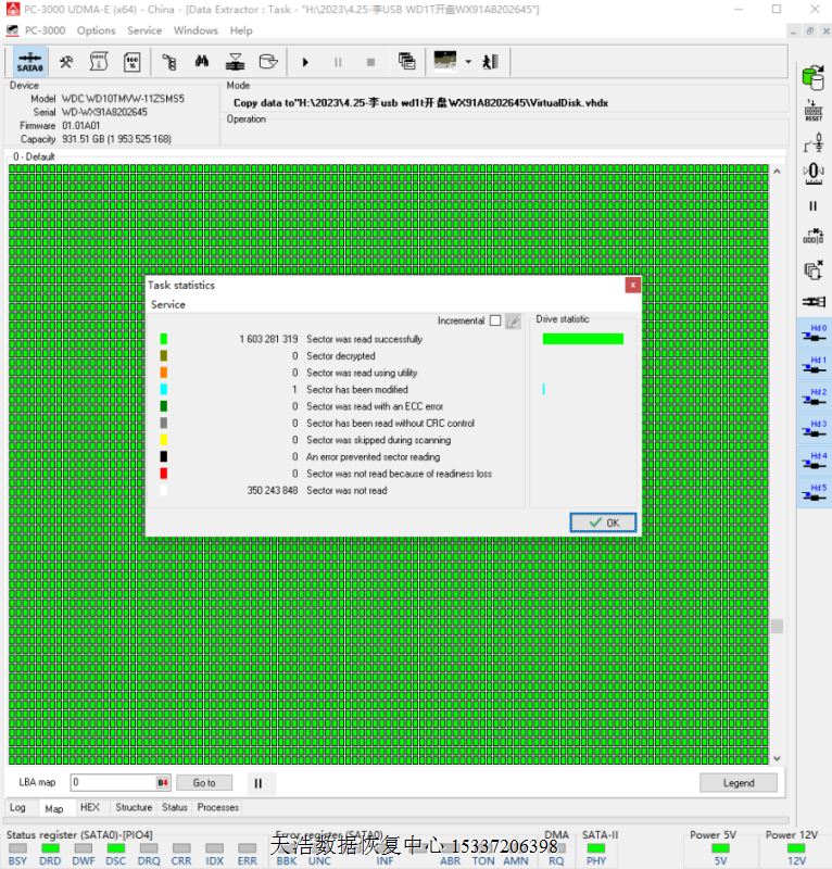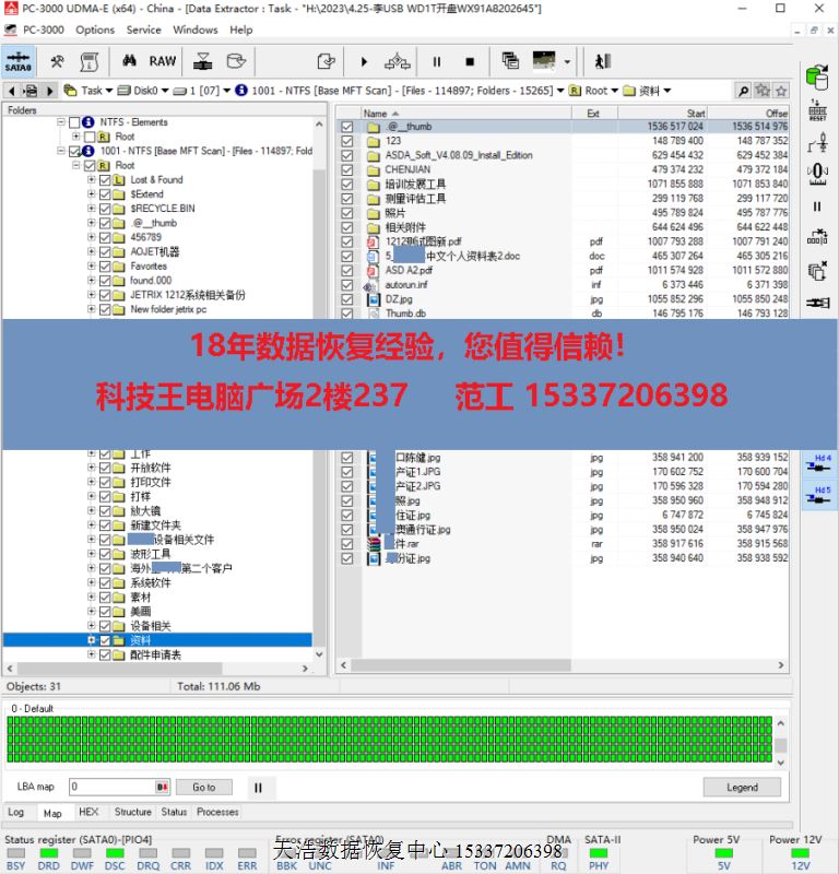 解决方案:收到硬盘后,在无尘环境更换兼容的磁头,再更换兼容sata电路板,接到专业数据恢复工具PC3000 UDMA EXPRESS上,通电硬盘认盘,备份好关键固件,DE分头镜像,最后客户硬盘内重要数据基本完美恢复!