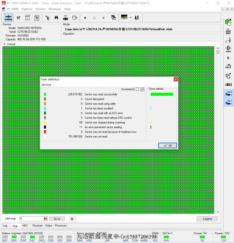解决方案:收到硬盘后,我们在无尘环境更换兼容的磁头,再接到数据恢复工具PC-3000 UDMA Express上,硬盘正常认盘,DE分头镜像,成功恢复硬盘内几乎全部数据!