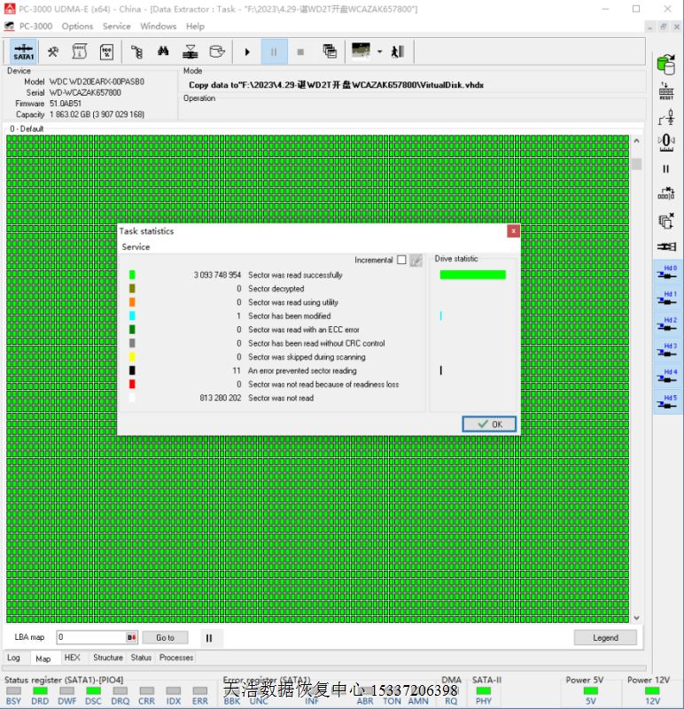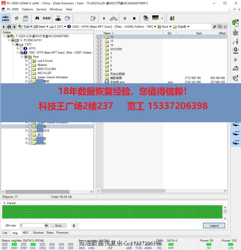 解决方案:收到硬盘后,接到数据恢复工具ACE PC3000 UDMA EXPRESS上,通电硬盘认盘,全盘坏道,检测发现5头损坏,在无尘环境开盘更换兼容的磁头,再接到ACE PC3000 UDMA EXPRESS上,通电硬盘正常认盘,数据区前后均能正常访问,DE分头镜像,成功恢复客户硬盘内几乎全部重要数据!