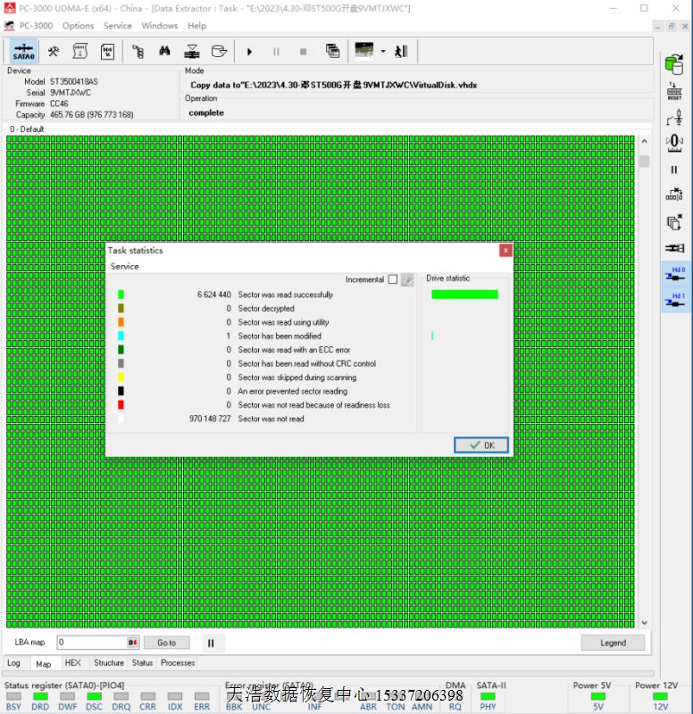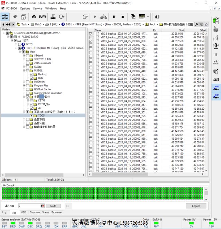 解决方案:收到硬盘后,在无尘环境拆开盘体,发现盘片内圈严重划伤,过滤棉变黑,清洗盘片后,更换兼容的磁头,做好限位处理后,再接到专业的数据恢复工具PC3000 UDMA EXPRESS上,通电硬盘正常认盘,DE镜像,成功恢复出客户硬盘内茶叶收购软件的原始数据库及备份数据!