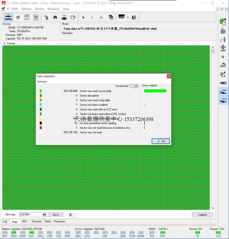 解决方案:收到硬盘后,我们在无尘环境更换兼容的磁头,再用编程器读ROM,使用数据恢复工具PC-3000 UDMA Express解锁后,编程器写回ROM,焊回原电路板,通电硬盘不认盘,检测备份修复固件后,断电再通电,硬盘正常认盘,DE分头镜像,最后硬盘内重要数据基本完美恢复!