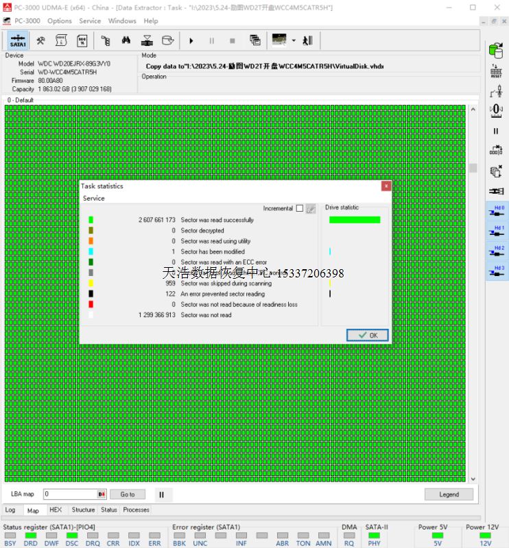解决方案:收到硬盘后,在无尘环境开盘更换兼容的磁头,再接到数据恢复工具ACE PC3000 UDMA EXPRESS上,通电硬盘正常认盘,备份关键固件,DE分头镜像,最后成功恢复客户硬盘内几乎全部数据!