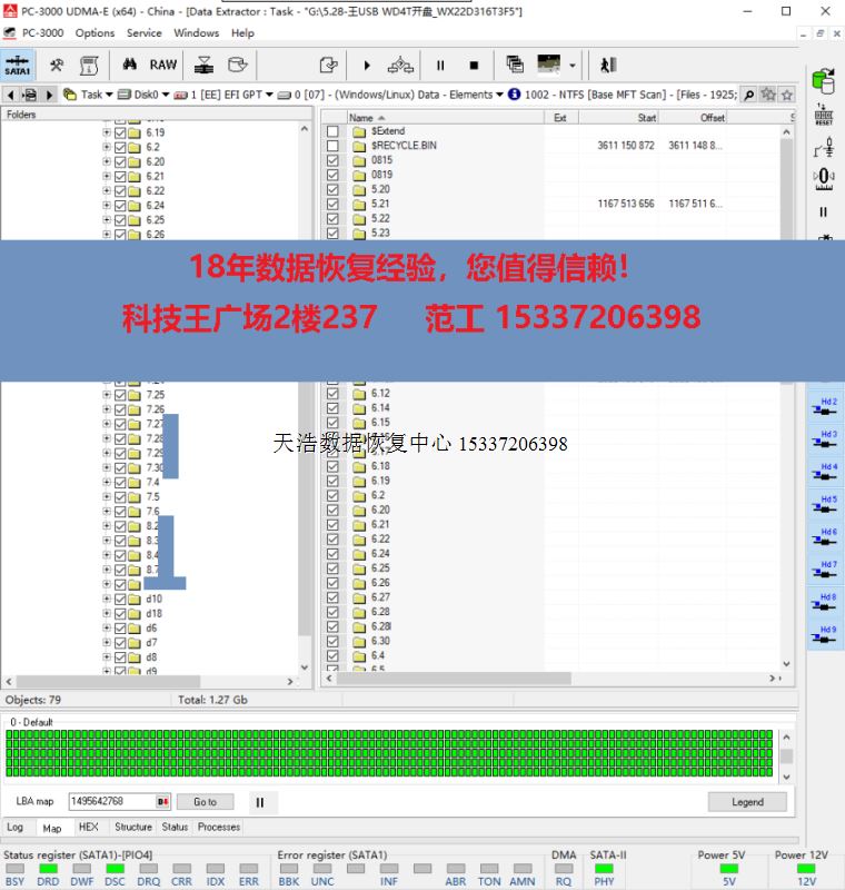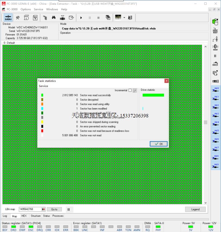 解决方案:收到硬盘后,我们在无尘环境更换兼容的磁头,原ROM解锁,原始usb板改SATA,接到专业数据恢复工具ACE PC3000 UDMA EXPRESS上,通电硬盘声音正常认盘,检测备份固件,再做好镜像前的固件处理工作,DE分头,镜像,最后客户硬盘内1.4T重要数据完美恢复!
