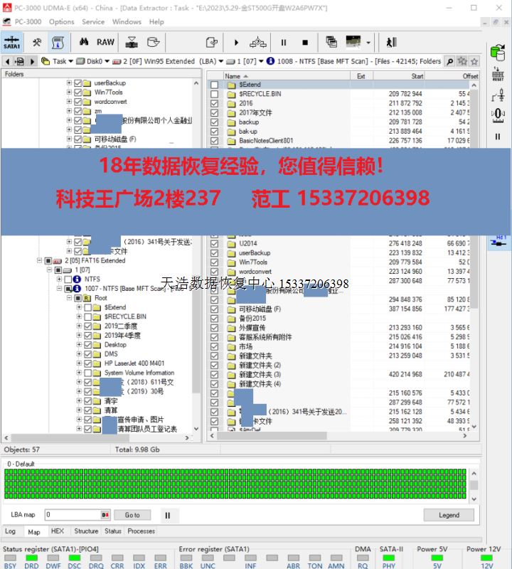 解决方案:收到硬盘后,在无尘环境拆开盘体,更换兼容的磁头,再接到专业的数据恢复工具PC3000 UDMA EXPRESS上,通电硬盘正常认盘,DE分头镜像,成功恢复出客户硬盘内几乎全部重要数据!