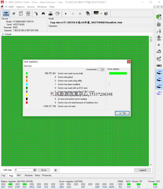 解决方案:收到硬盘后,在无尘环境开盘检测,发现盘片有一个面有轻伤,清洗盘片后,更换兼容的磁头,接到数据恢复工具PC-3000 UDMA Express上,通电硬盘正常认盘,备份好关键固件,做好数据恢复的前期处理后,DE分头镜像,最后客户硬盘内的重要数据大部分成功恢复!