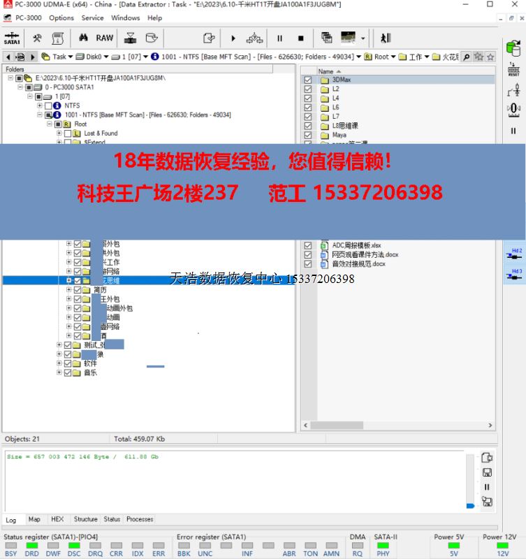 解决方案:收到硬盘后,我们在无尘环境更换兼容的磁头,再接到专业数据恢复工具PC3000 UDMA-E上,通电硬盘正常认盘,DE镜像,成功恢复客户硬盘内几乎全部数据!