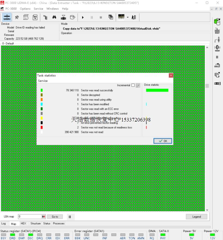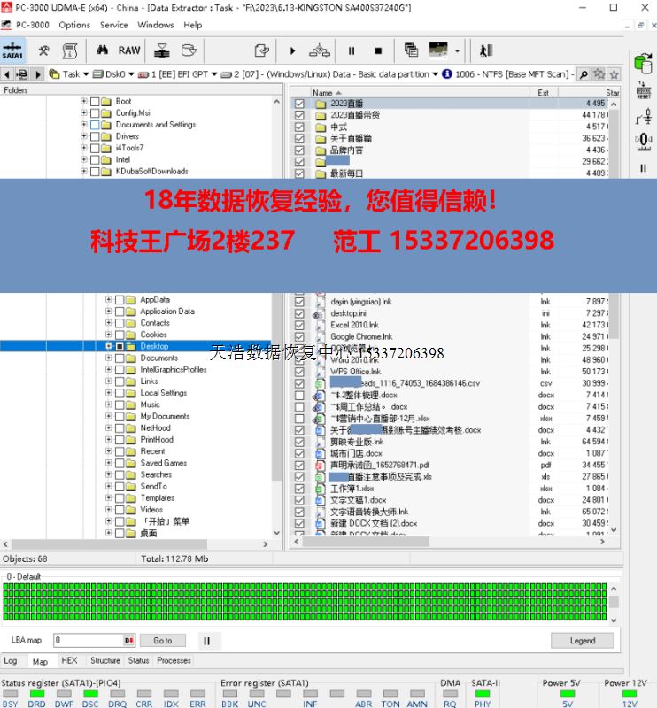 解决方案:收到硬盘后,接到专业的数据恢复工具PC-3000 UDMA Express上,检测硬盘正常认盘,但访问数据,硬盘立马就忙了!通过特殊方法处理后,DE镜像,成功恢复出客户桌面上的重要资料。