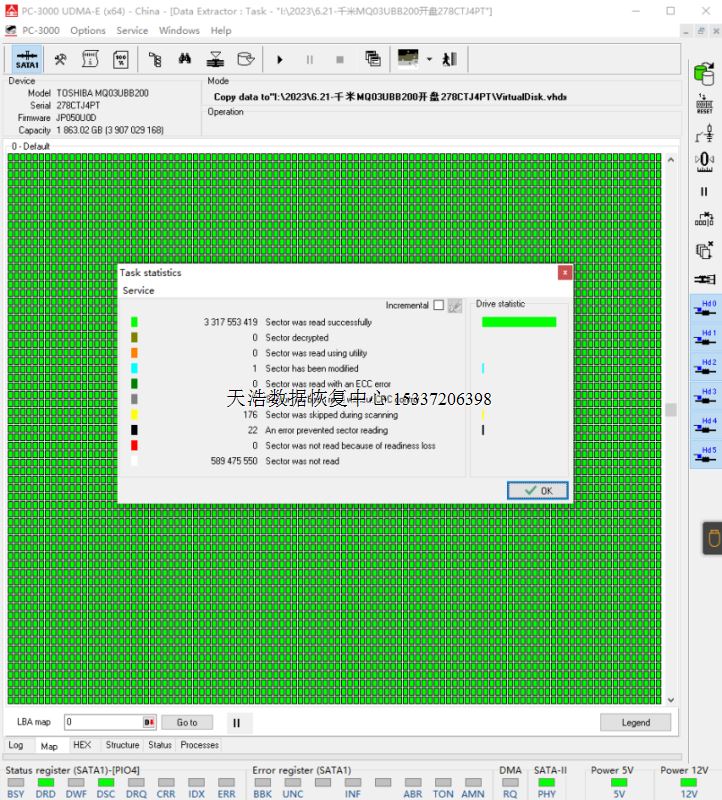 解决方案:收到硬盘后,我们在无尘环境更换兼容的磁头,接到数据恢复工具PC3000 UDMA EXPRESS上,通电认盘,DE镜像,成功恢复客户硬盘内几乎全部数据。
